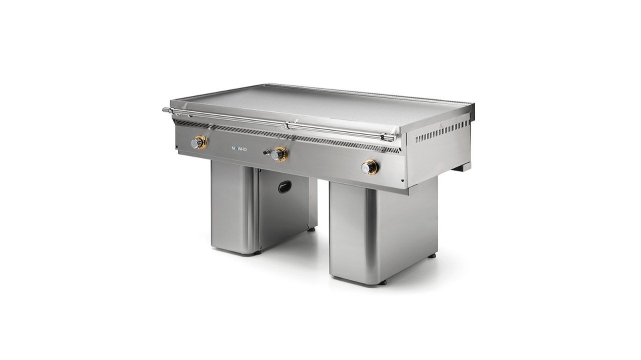 Están diseñados con quemadores que ramifican la llama alrededor de la placa, de manera que toda la superfície tiene una temperatura uniforme. La recogida de residuos se situa en la parte inferior de la máquina (solo en modelos con pies de soporte), con gran capacidad de reolección, de tal forma que su limpieza es mucho más cómoda para el cocinero.
